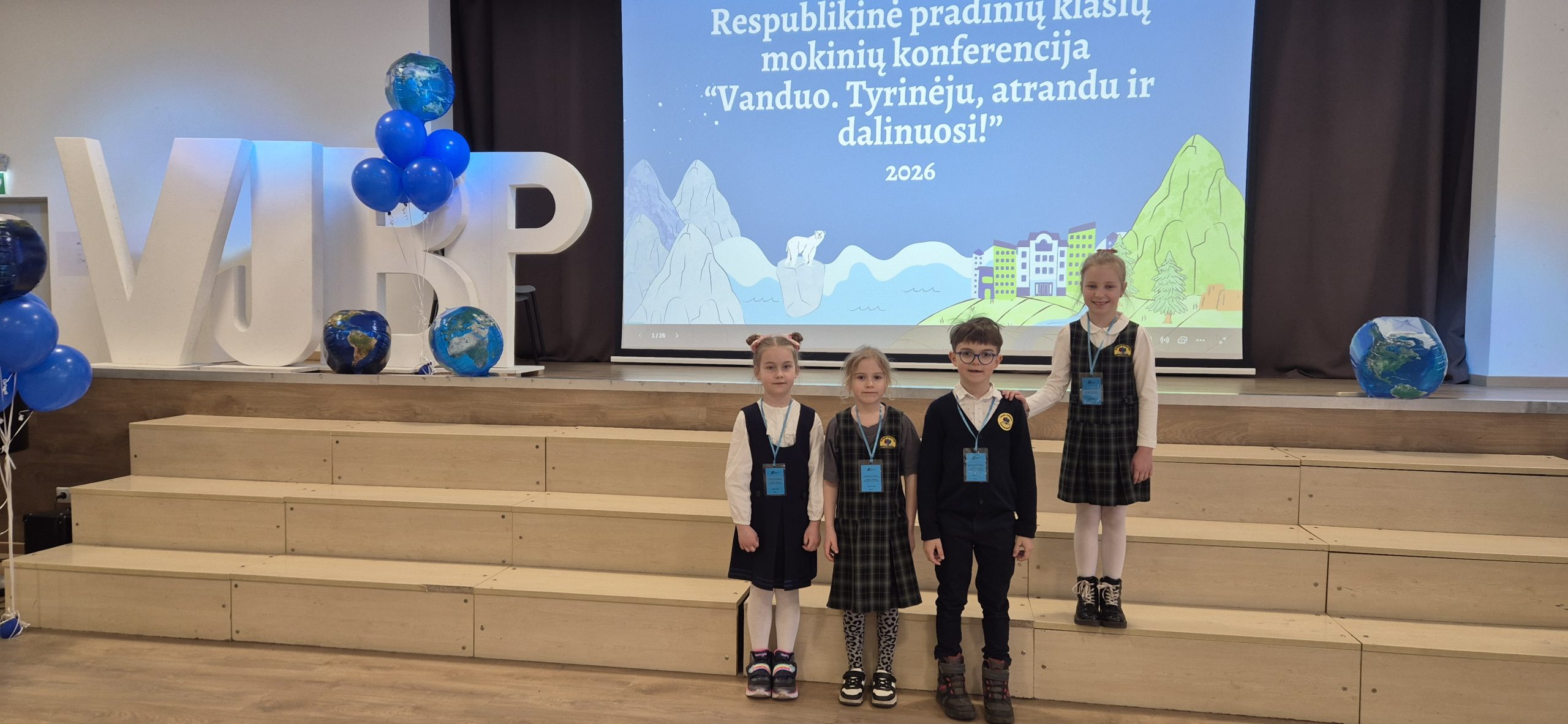 Konferencijoje dalyvavo ir mūsų mokyklos-darželio 1B klasės mokiniai: Kamilė Pažusytė, Viktoria Svetoslava Jasiūnaitė, Ieva Filipavičiūtė ir Vincas Vasilevičius. Jaunieji tyrėjai pristatė net du pranešimus, kuriuose dalijosi savo atliktais eksperimentais ir atradimais apie vandenį, taip pat atkreipė dėmesį į ekologinius klausimus – vandens tausojimą ir atsakingą žmogaus elgesį gamtoje.