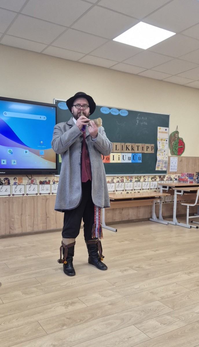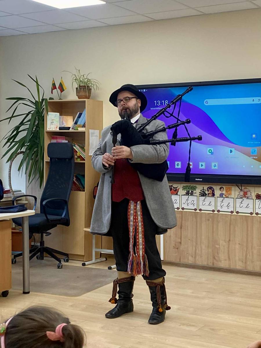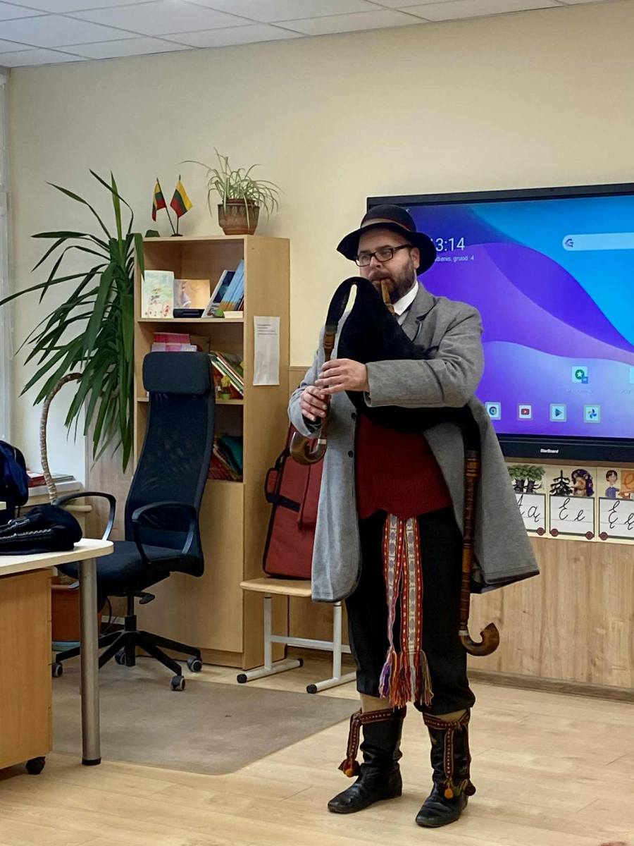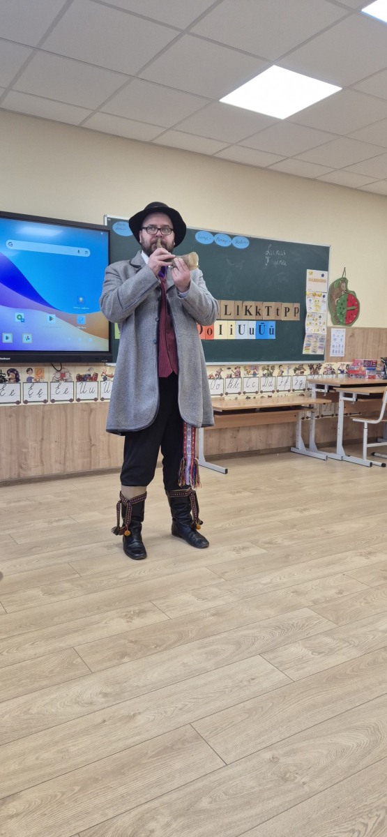 Šiandien 1B klasėje vyko jauki ir įkvepianti muzikinė popietė. Į svečius atvyko lietuvių nacionalinį kostiumą vilkintis muzikantas iš pašaukimo Šarūnas. Nors tai nėra jo pagrindinis darbas, jis su didžiule meile pristatė įvairius instrumentus ir jais pagrojo: subtiliai skambančia Labanoro dūda, dūdmaišiu, ragu ir dūdele.