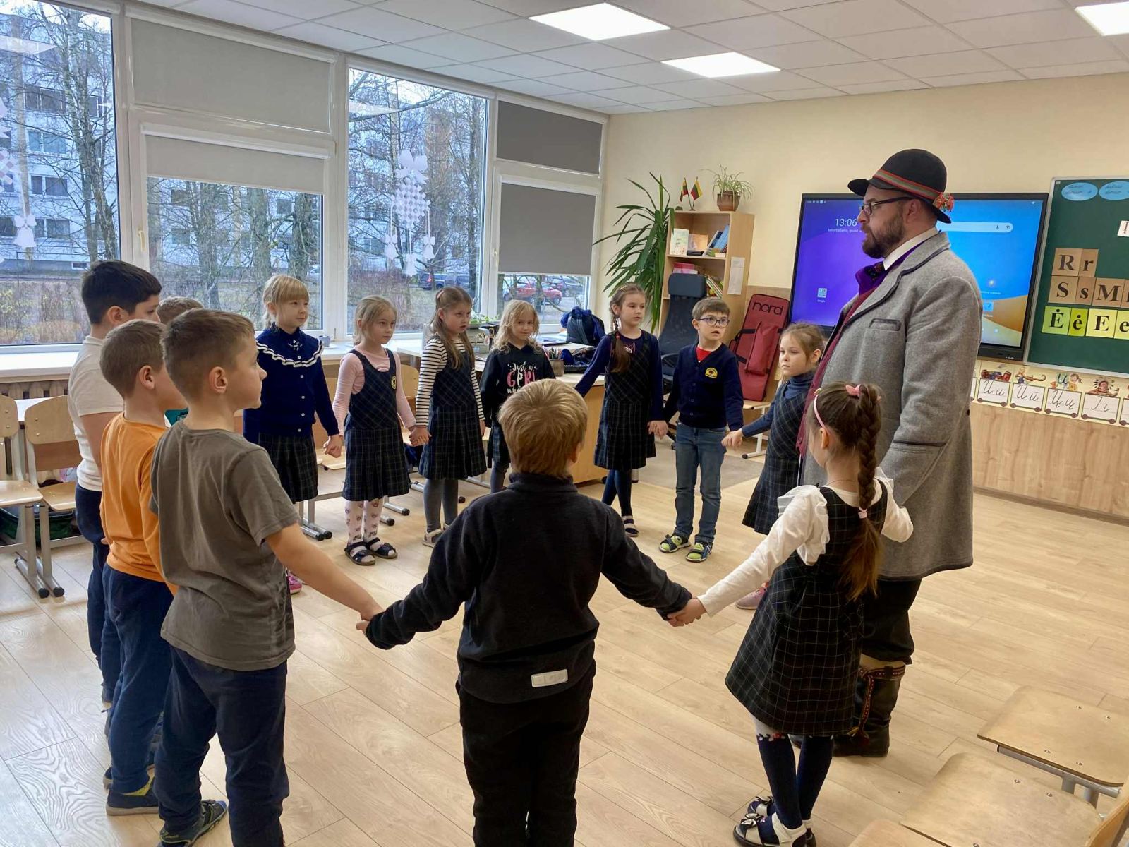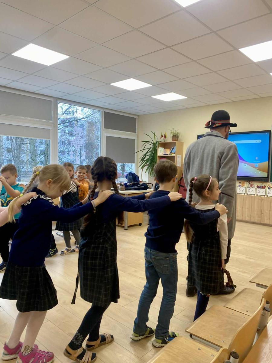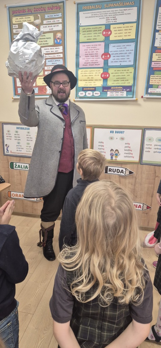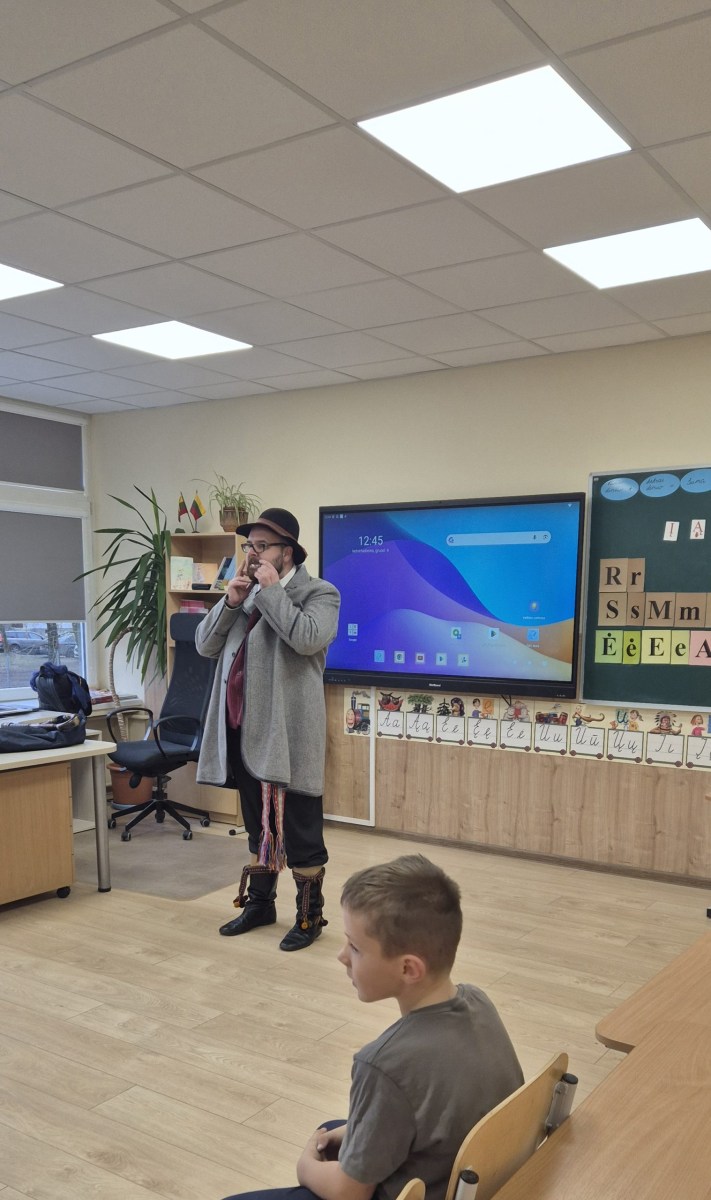 Šiandien 1B klasėje vyko jauki ir įkvepianti muzikinė popietė. Į svečius atvyko lietuvių nacionalinį kostiumą vilkintis muzikantas iš pašaukimo Šarūnas. Nors tai nėra jo pagrindinis darbas, jis su didžiule meile pristatė įvairius instrumentus ir jais pagrojo: subtiliai skambančia Labanoro dūda, dūdmaišiu, ragu ir dūdele.