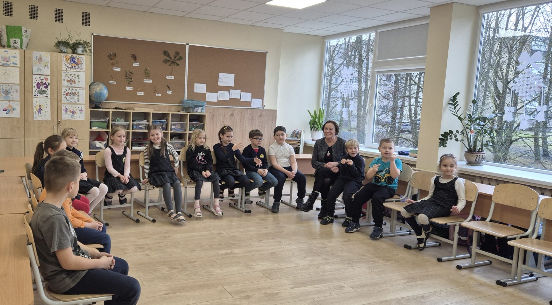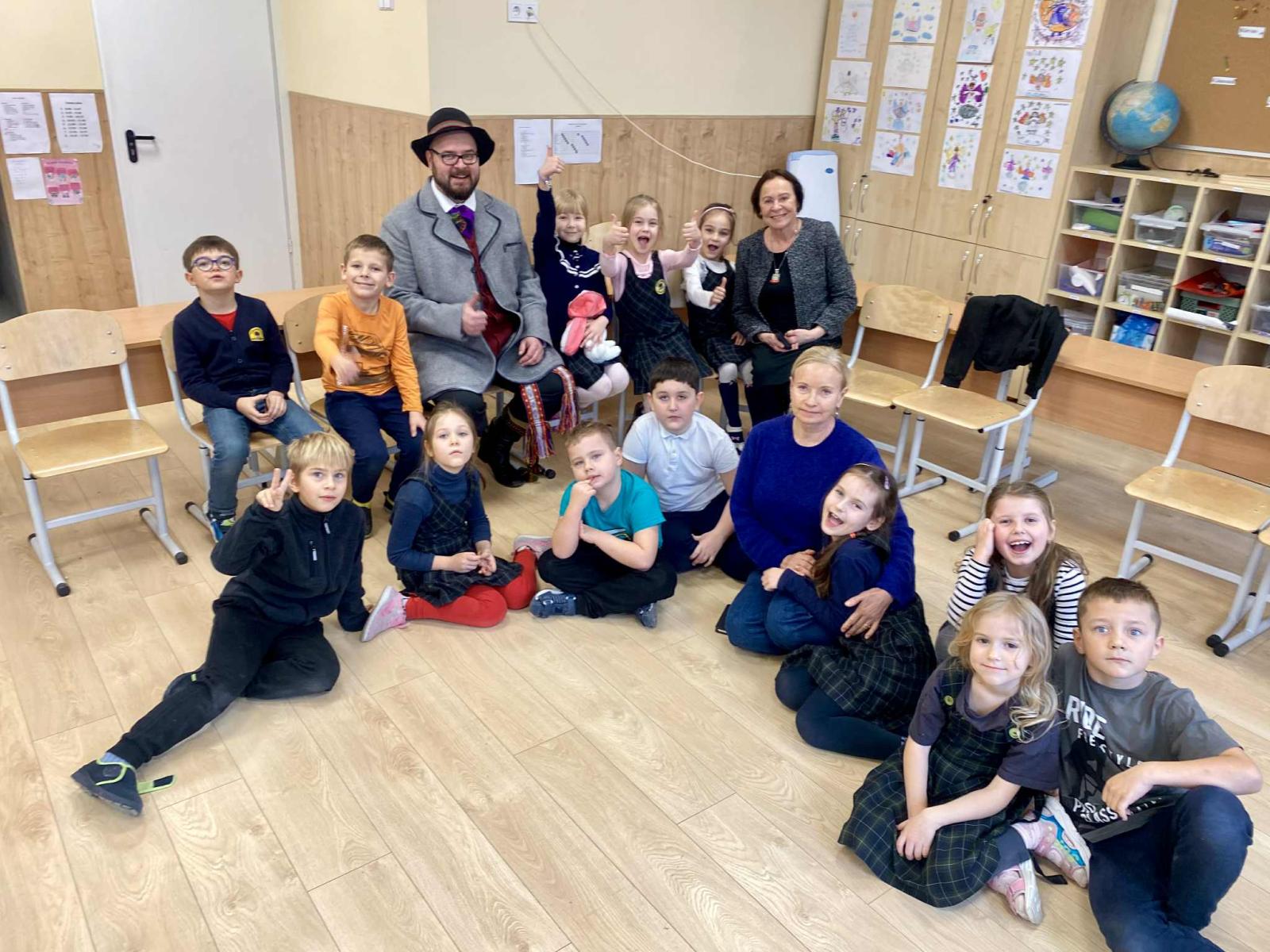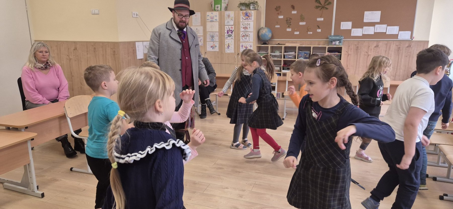Kartu su vaikais Šarūnas dainavo lietuvių liaudies dainas, šoko ratelius, žaidė žaidimus. Mokiniai aktyviai prisidėjo – plojo, mušė taktą koja, drąsiai įsitraukė į veiklas. Visi liko sužavėti. Labai labai.